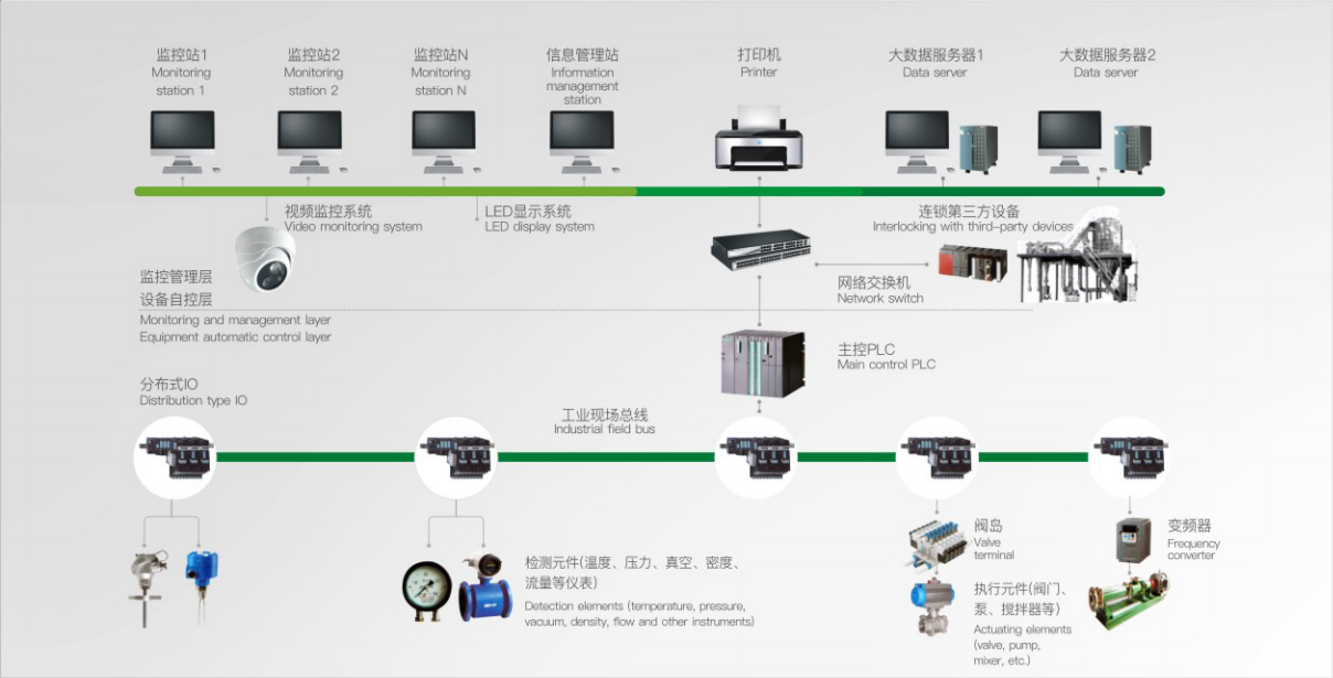 3.工艺设备的自动化控制中心:对工艺设备中泵的启停、阀门通断、生产工艺参数(温度、压力、真空、密度等)的自动控制。