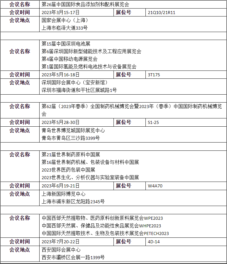 2023所参的展会覆盖多个行业:医药、食品、化工、电子化学品、新能源等。